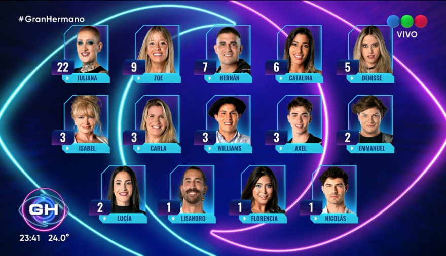 Anoche comenzó oficialmente GH 2023 con las primeras votaciones entre ellos. Los 22 jugadores pasaron por el confesionario y nominaron a dos compañeros. Los más votados fueron Juliana con 22 votos (que utilizó la espontánea) , Zoe con 9, Hernán con 7 y Catalina cosechó 6 unidades. Uno de ellos abandonará la competencia el próximo domingo, o no, porque todavía queda el poder del líder.