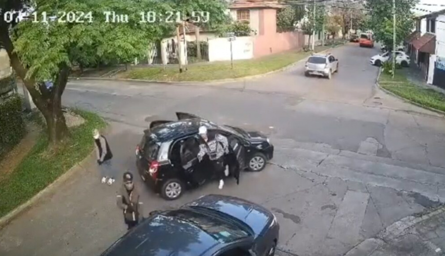 Las imágenes de las cámaras de seguridad captaron el momento en el cual cuatro delincuentes se bajaron de un Toyota Etios y apuntaron hacia el interior del vehículo donde estaba el gendarme, junto a un compañero de la fuerza.