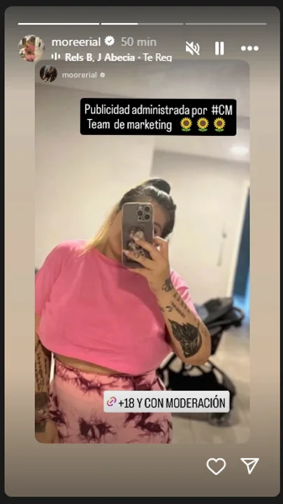 Vestida con un conjunto rosa, la influencer compartió una imagen con el mensaje: “Publicidad administrada por #CM – Team de marketing”, y agregó la advertencia “+18 y con moderación”.