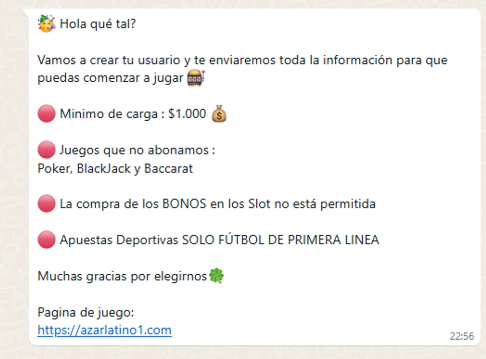 En uno de los mensajes difundidos, se puede leer: “Vamos a crear tu usuario y te enviaremos toda la información para que puedas comenzar a jugar 🎰. Mínimo de carga: $1.000 💰”. Además, se aclara que las apuestas deportivas solo incluyen fútbol de primera línea y no se permite la compra de bonos en los slots.