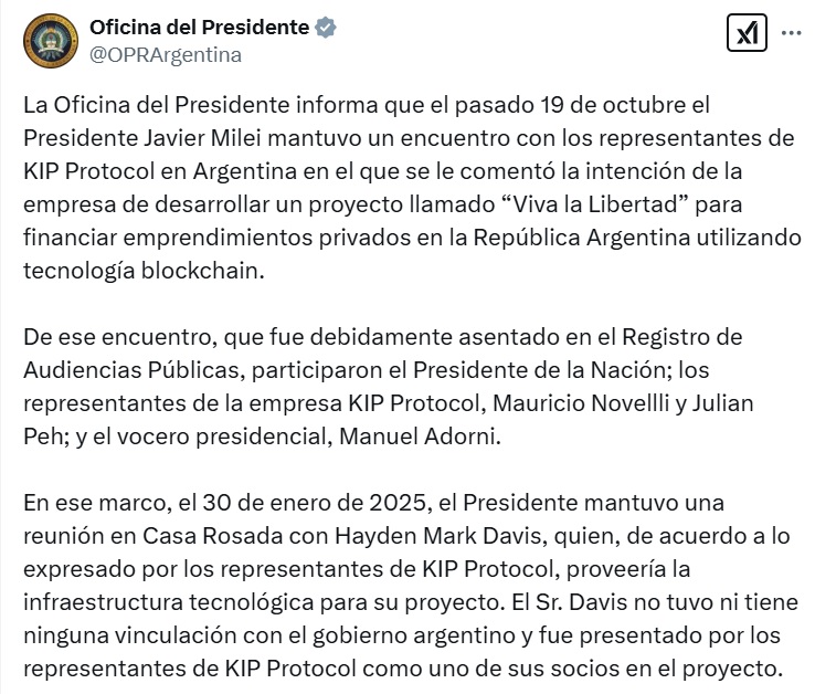 Las versiones que incluyen a Karina Milei fueron desmentidas. Informaron que cuando el mandatario difundió su posteo “en ningún momento dijo: ‘vayan e inviertan’”. Es un argumento contra los planteos de que se trató de un tuit promocional que esgrimen sus críticos más duros. Pero también destacan que Javier Milei “siempre promueve proyectos privados de empresas”, sobre todo los vinculados a la economía del conocimiento, la inteligencia artificial y la tecnología en general.