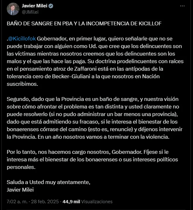 En un mensaje publicado en la red social X (ex Twitter), Milei calificó la situación en Buenos Aires como un “baño de sangre” y aseguró que Kicillof “no puede resolver el problema de la inseguridad”.