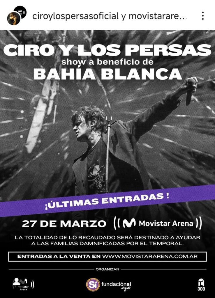 Ciro y Los Persas van a dar un recital benéfico en el Movistar Arena. Los ingresos se destinarán a ayudar a los afectados por el temporal de la semana pasada en Bahía Blanca. La presentación organizada por la banda, 300 Producciones, Movistar Arena y Fundación Sí, será este 27 de marzo, en el estadio cubierto de la Ciudad Autónoma de Buenos Aires. Los tickets pueden conseguirse desde el mediodía de este viernes 14, únicamente desde la web del estadio.