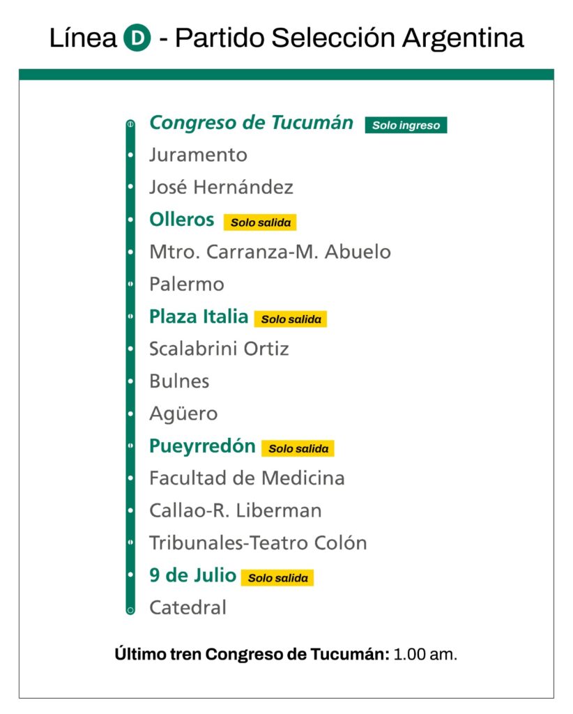 Por otro lado, ese mismo día, funcionará un servicio especial en la Línea D, para colaborar con la desconcentración del partido de la Selección Argentina, que se jugará en el Estadio Más-Monumental. Para eso, la estación Congreso de Tucumán, la más cercana a la cancha, permanecerá abierta dos horas más.