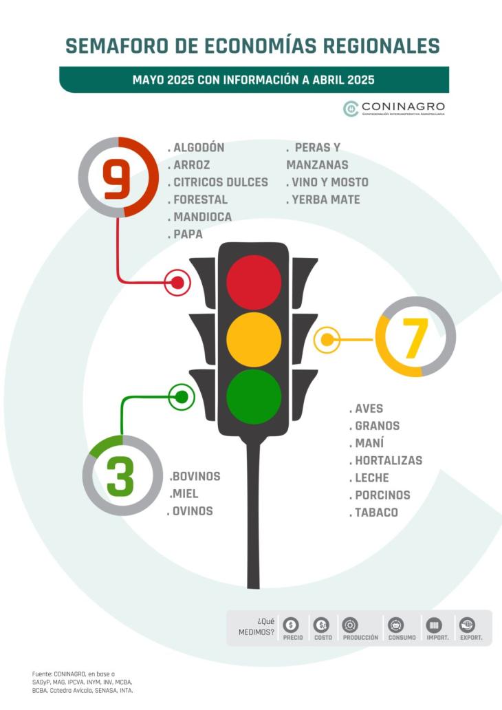 Se trata de un índice que busca reflejar la actualidad de las economías regionales, a través de colores para una comprensión más sencilla. Para el mes de abril, Coninagro relevó que el semáforo de las economías regionales mostró tres actividades en verde, una más que en el mes anterior (se sumó la miel) y siete en amarillo.