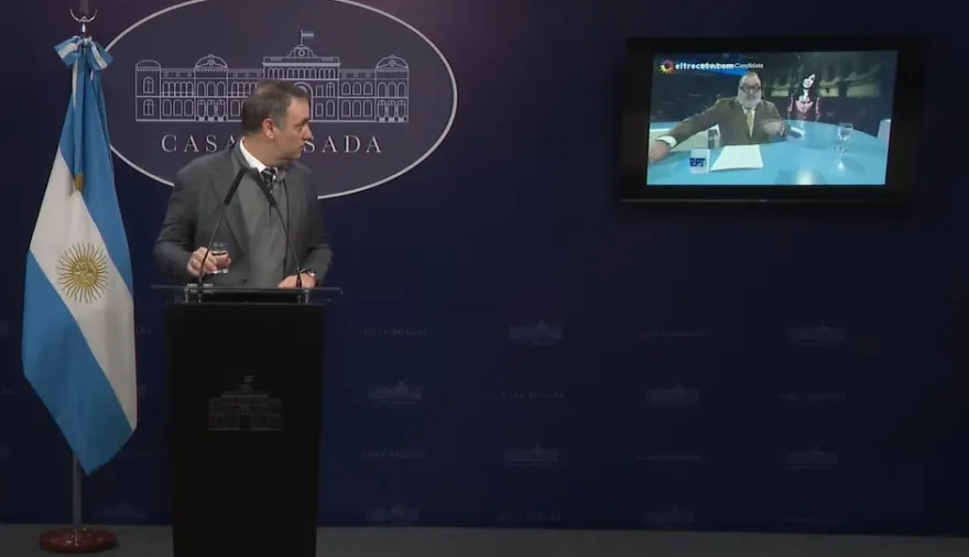 En la previa del anuncio, se mostró un fragmento del informe de Periodismo Para Todos (PPT) sobre La Ruta del Dinero K. Adorni retomó el video para justificar la decisión del cierre de Vialidad Nacional.