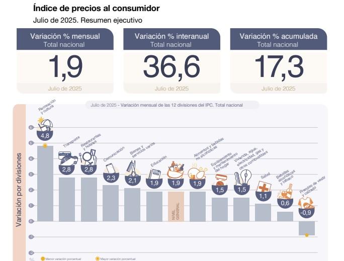 Se conoció el IPC de julio: fue de 1,9%, acumulando 17,3% en los primeros siete meses de 2025. En términos interanuales se ubicó en 36,6%.