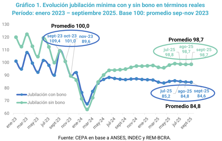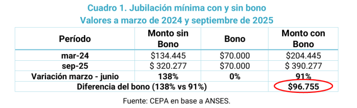 Entre marzo de 2024 y septiembre de 2025, las jubilaciones aumentaron 138%, pero la mínima con bono incluido subió apenas 91%. De acuerdo con el informe publicado por el Centro de Economía Política Argentina (CEPA), de haber seguido la misma actualización que los haberes, el bono debería haberse elevado a $166.755, es decir, más del doble de lo que se paga actualmente.