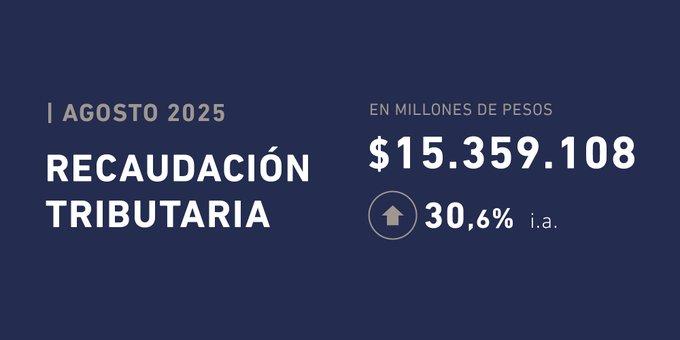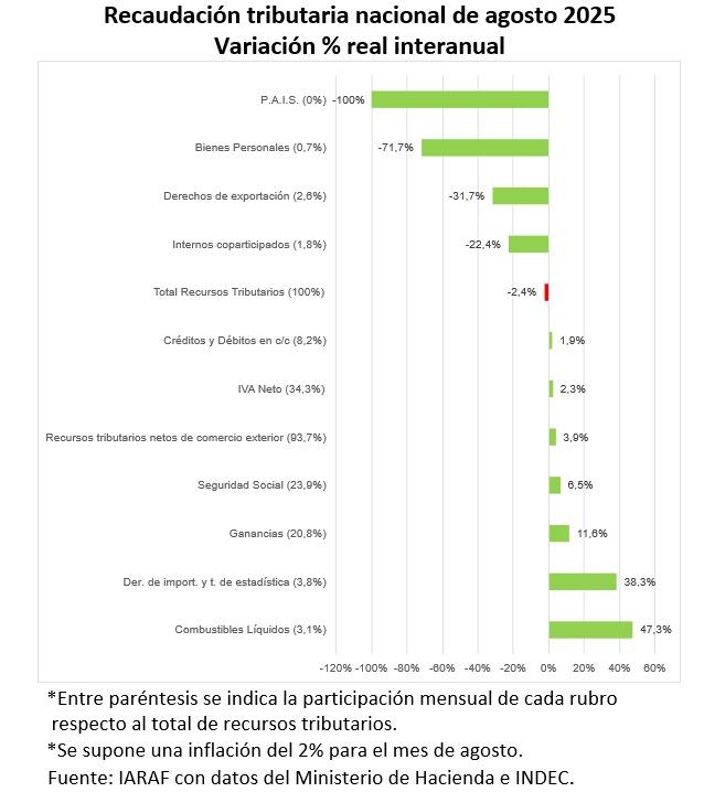 La recaudación tributaria de ARCA (ex-AFIP) alcanzó en agosto $15.359.108 millones, mostrando un aumento de 30,6% interanual, que representa una baja de 2,4% en términos reales (es decir, descontando el factor inflación), si consideramos una inflación en agosto de 2%.