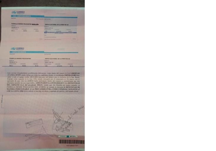 Fiorella Denise Policastro Bassallo, cuarta suplente en la lista de concejales, oficializó su salida con una carta documento y audios en los que responsabilizó a referentes locales por presiones y arreglos económicos.