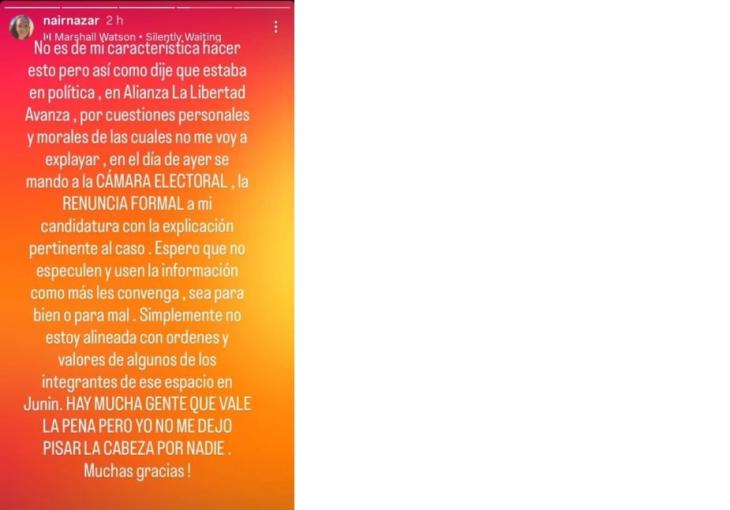 A su renuncia se sumaron las de María Stella Saldías y Naiz Nazar, quienes también abandonaron la lista alegando incompatibilidades con el manejo interno del espacio. “No estoy alineada con órdenes y valores de algunos integrantes”, sostuvo Nazar al anunciar su decisión.