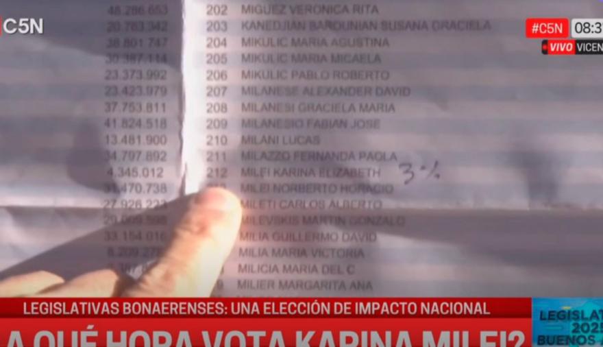 La jornada electoral bonaerense arrancó con una provocación política en Vicente López. Los padrones exhibidos en la entrada del Instituto Pedro Poveda, donde vota Karina Milei, aparecieron vandalizados con la inscripción “3%” al lado de su nombre.