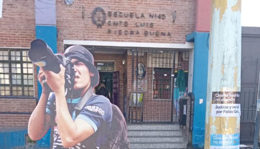 Este domingo 7 de septiembre, en la Escuela N° 45 “Luis Piedrabuena” de Remedios de Escalada, se instaló una gigantografía del fotógrafo Pablo Grillo, quien debía votar en ese establecimiento.