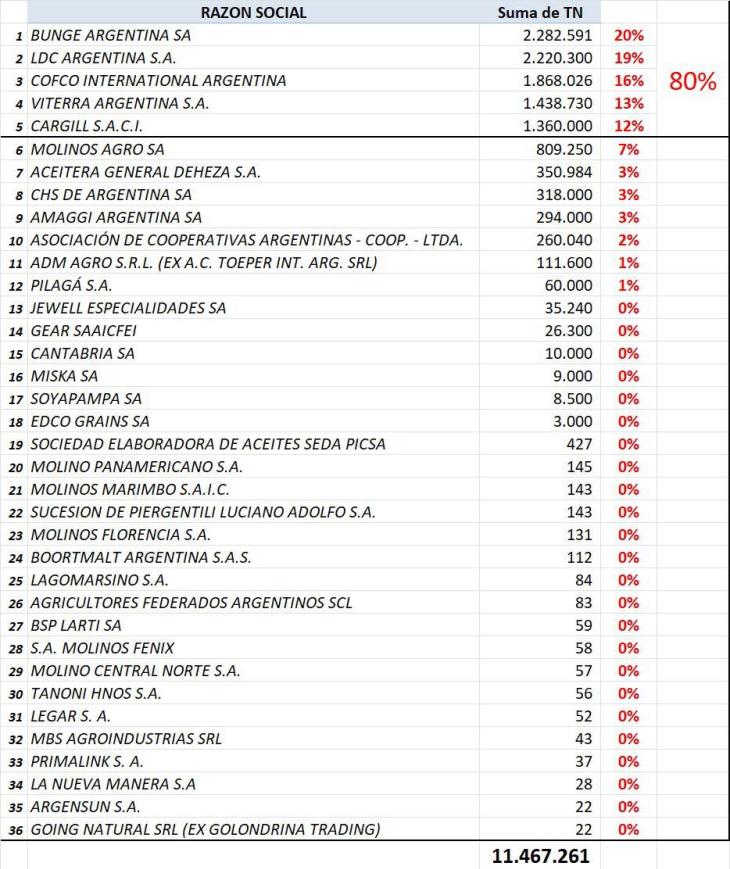 Al pie de la tabla aparecen casos casi simbólicos, como Agricultores Federados Argentinos, con apenas 83 toneladas, y Going Natural SRL (ex Golondrina Trading) con 22 toneladas.