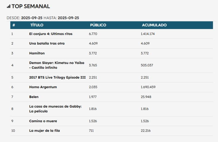 El verdadero protagonismo recayó en el cine argentino, que logró meter tres de sus producciones entre las diez más vistas del día. Películas como Homo Argentum (sexto lugar), que ya roza las 1,7 millones de espectadores acumuladas y La mujer en la fila (10ª) se ubicaron en el top semanal.