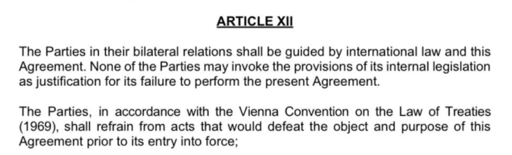 Las Partes, en sus relaciones bilaterales, se guiarán por el derecho internacional y por el presente Acuerdo. Ninguna de las Partes podrá invocar las disposiciones de su legislación interna como justificación para su incumplimiento del presente Acuerdo. Las Partes, de conformidad con la Convención de Viena sobre el Derecho de los Tratados (1969), se abstendrán de realizar actos que frustren el objeto y propósito de este Acuerdo antes de su entrada en vigor.