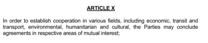 Con el fin de establecer cooperación en diversos campos, incluyendo el económico, el tránsito y el transporte, el medioambiental, el humanitario y el cultural, las Partes podrán celebrar acuerdos en las respectivas áreas de interés mutuo.