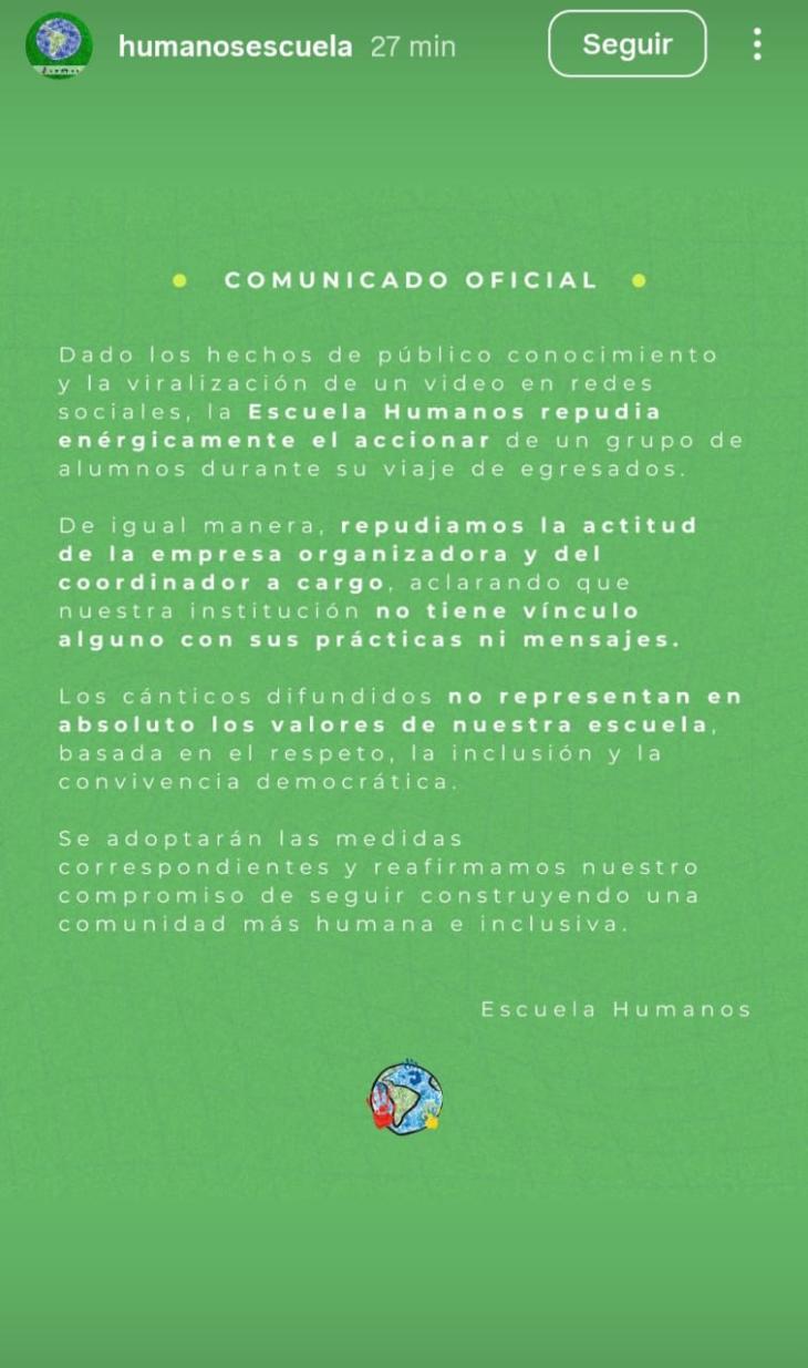 Tras la rápida viralización de las imágenes en redes sociales, la Escuela Humano emitió un comunicado oficial este domingo, repudiando el hecho y desvinculándose de las acciones de los alumnos.