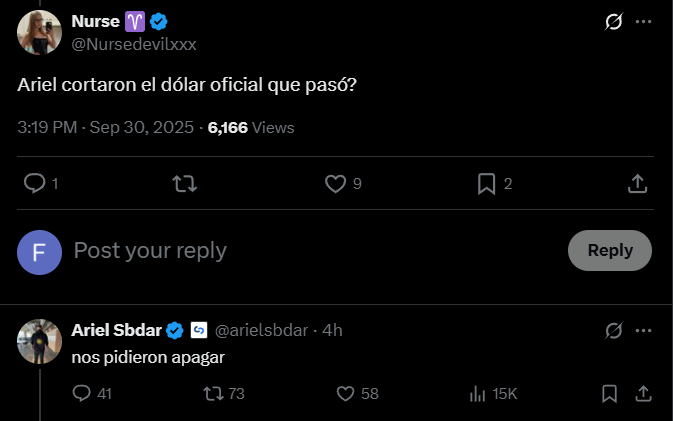 La controversia se multiplicó cuando Aries Sbdar, dueño de una ALyC popular, Cocos Capital, al ser consultado por un usuario que no podía acceder a la operatoria habitual en X le respondió: “Nos pidieron apagar”, lo que disparó dudas y especulaciones.