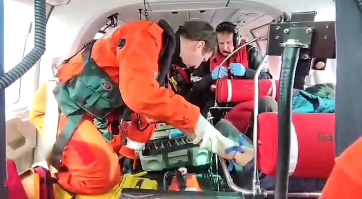 Por primera vez, la Estación Aérea Viedma desplegó un avión de patrullaje para evaluar las condiciones de la zona. En tanto, un helicóptero de rescate partió desde Comodoro Rivadavia. Con una precisión milimétrica, izó al tripulante desde el buque en plena navegación.