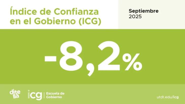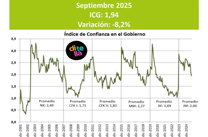 El Índice de Confianza en el Gobierno (ICG) elaborado por la Universidad Torcuato Di Tella marcó en septiembre una nueva caída y perforó la barrera de los 2 puntos por primera vez en la gestión de Javier Milei. El registro se ubicó en 1,94 puntos, con un retroceso del 8,2 % intermensual y del 10 % interanual, convirtiéndose en el nivel más bajo desde diciembre de 2023.