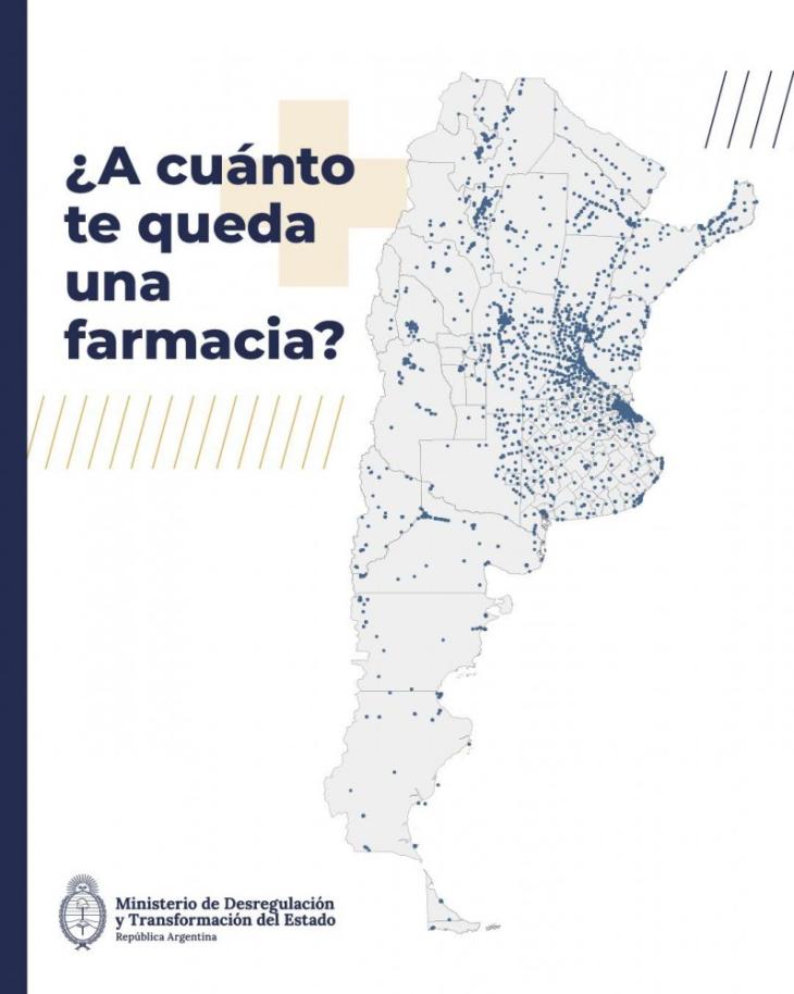 Sturzenegger defendió el delivery de medicamentos al hogar, que generó resistencia en las farmacéuticas, porque "protege la salud pública evitando que gente enferma circule, aumentando la posibilidad de contagios". Según el ministro, "en un país de 2,8 millones de km², la entrega a domicilio no es un lujo: es salud. Lo mostramos georreferenciando las 15.000 farmacias existentes, donde se ve claramente el vacío en zonas rurales o menos urbanizadas".