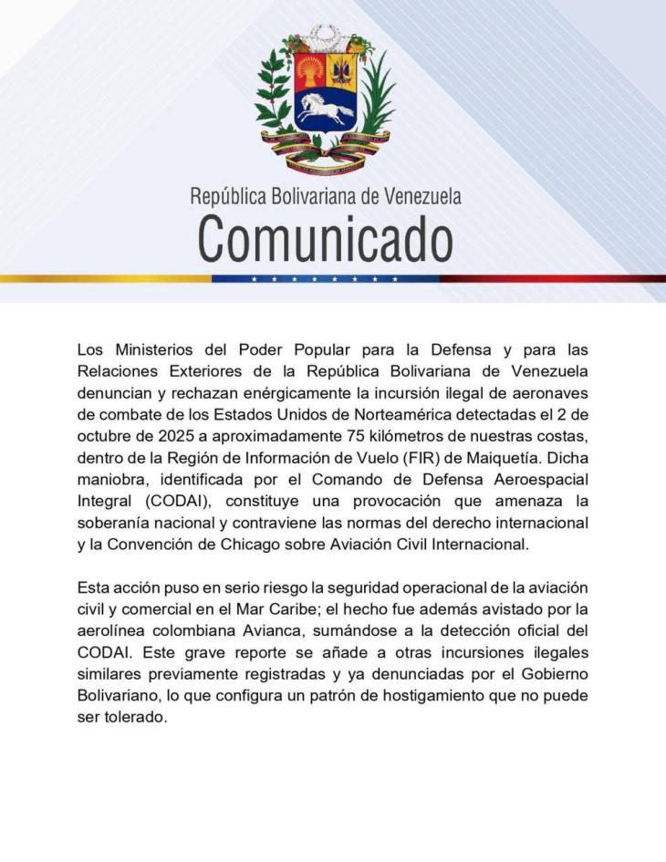 El gobierno de Nicolás Maduro denunció esta semana que aviones de combate de Estados Unidos habrían sobrevolado las cercanías del espacio aéreo venezolano, en lo que calificó como un acto de provocación militar. Según el ministro de Defensa, Vladimir Padrino López, al menos cinco aeronaves fueron detectadas por el sistema de defensa aérea, e incluso pilotos de aerolíneas comerciales habrían confirmado los avistamientos. Sin embargo, hasta ahora no se han presentado pruebas verificables ni confirmaciones internacionales que respalden la acusación.