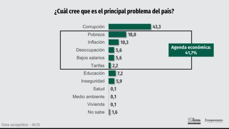 En el relevamiento, el 43,3% de los consultados considera que la corrupción es el principal problema del país, superando al bloque económico (41,7%), que incluye pobreza (18%), inflación (10,3%), desocupación (5,6%), salarios bajos (5,6%) y tarifas (2,2%).