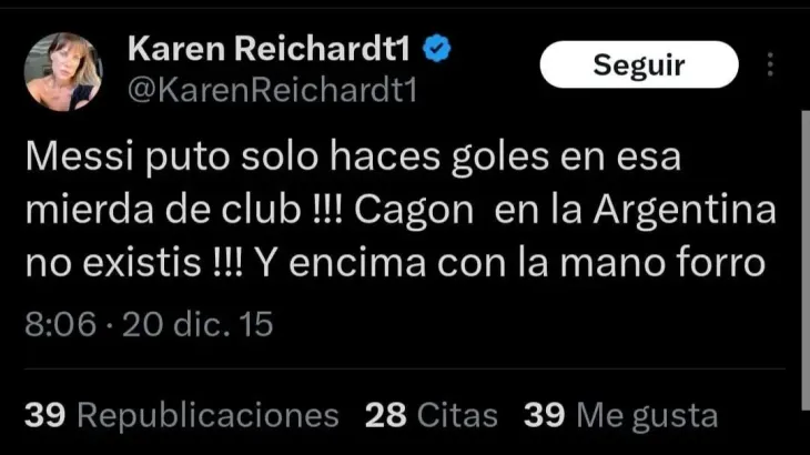Todavía dolida por el resultado, Reichardt publicó en Twitter: "Messi puto, sólo hacés goles en esa mierda de club!!! Cagón, en la Argentina no existís!!! Y encima con la mano, forro". Por si fuera poco, más tarde hubo más insultos despiadados hacia el astro rosarino.
