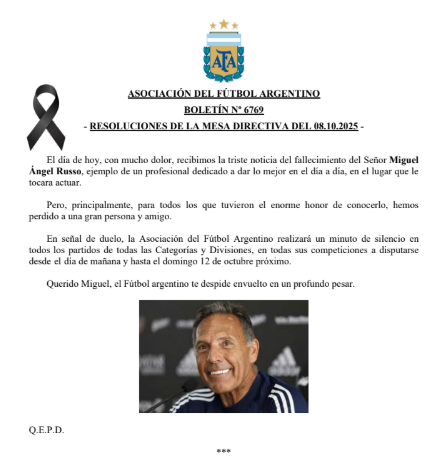 La Asociación del Fútbol Argentino anunció que se realizará un minuto de silencio en todos los partidos de todas las categorías y divisiones del fútbol argentino, en homenaje a Miguel Ángel Russo, fallecido ayer 8 de octubre a la edad de 69 años. El gesto se extenderá durante la jornada del fin de semana, como muestra de respeto y reconocimiento a su trayectoria como jugador y entrenador.