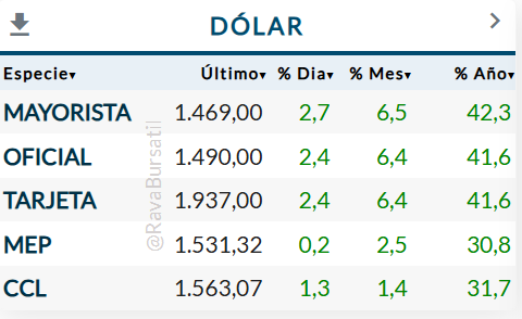 Los tipos de cambio financieros también arrancaron la jornada con subas. El contado con liquidación (CCL) trepa 1,3% y se ubica en $1.563, mientras que el dólar MEP avanza 0,2%, para operar en torno a $1.531.