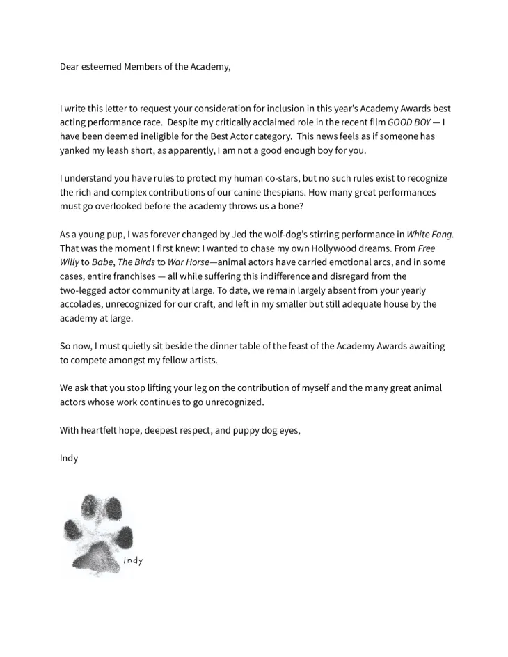 La película de terror Good Boy, protagonizada por el perro Indy, lanzó una campaña que busca reconocimiento para los actores animales en los Oscar. A través de una carta abierta dirigida a la Academia de las Artes y las Ciencias Cinematográficas, firmada por el propio Indy, el estudio independiente IFC aboga por incluir a los intérpretes de cuatro patas en las categorías de actuación.