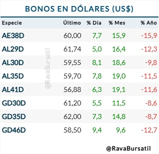 Los bonos argentinos volaron en dólares: entre 5% (en AL29) y 9,4% (el GD46), recuperando gran parte del terreno perdido durante este año.