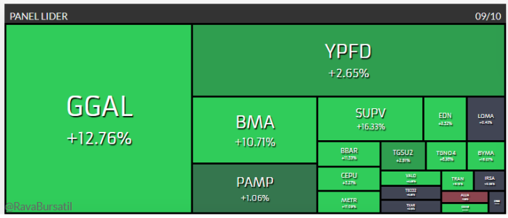 Las principales acciones también volaron. Subieron principalmente los bancos, Galicia 12,6%, Macro 10,71%, Supervielle 16,26%, Banco Francés 11,27%, pero también las energéticas como YPF 2,65% y Pampa 1,06%.