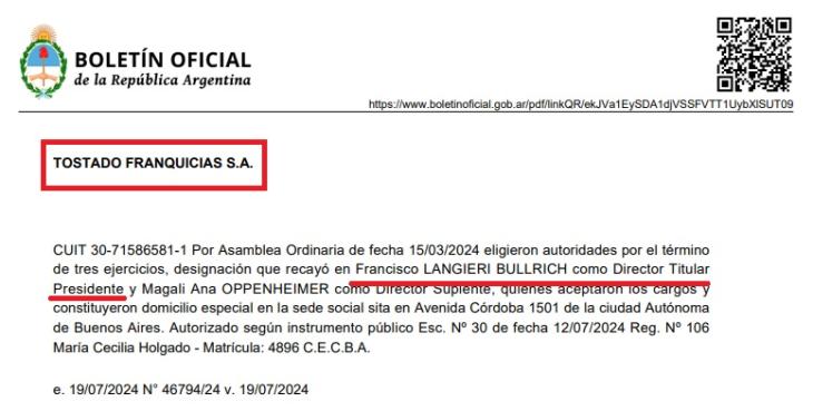 Según los registros del Boletín Oficial, el hijo de Patricia Bullrich, Francisco Langeri Bullrich, aparece como figura central en esas tres estructuras. En 2016 asumió como gerente de Tostado Buenos Aires SRL; en 2022 poseía el 95% de las cuotas sociales y en 2024 fue designado presidente de Tostado Franquicias S.A., al frente de la expansión comercial.