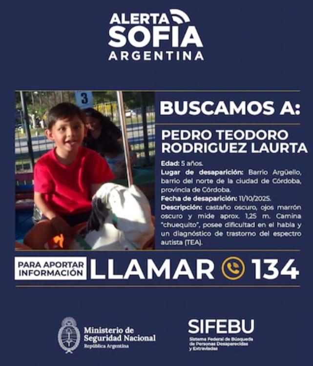 La Unidad Judicial Homicidios pide colaboración para dar con el paradero de Pedro Teodoro Rodriguez Laurta, de 5 años, quien fue sustraído del domicilio de su madre, ubicado en el barrio Villa Serrana de la ciudad de Córdoba.