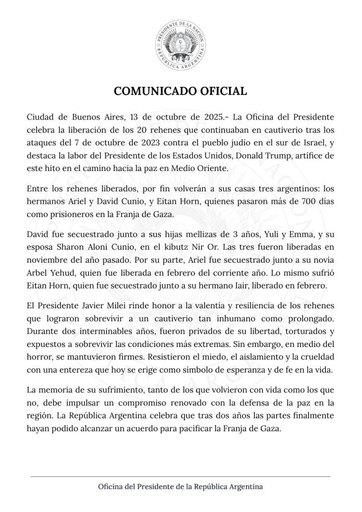 El Gobierno subrayó que el presidente Javier Milei “rinde honor a la valentía y la entereza de los rehenes” y llamó a renovar el compromiso con la paz en Medio Oriente.