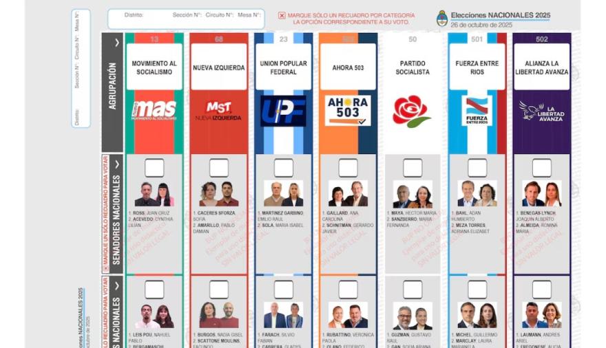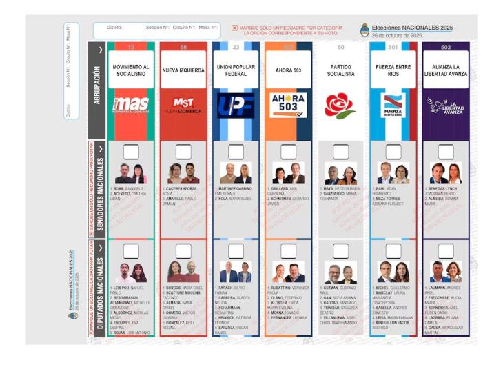 Cada elector recibirá una única boleta oficial, idéntica para todos los votantes del distrito, que mostrará las listas y candidatos de todas las fuerzas habilitadas.