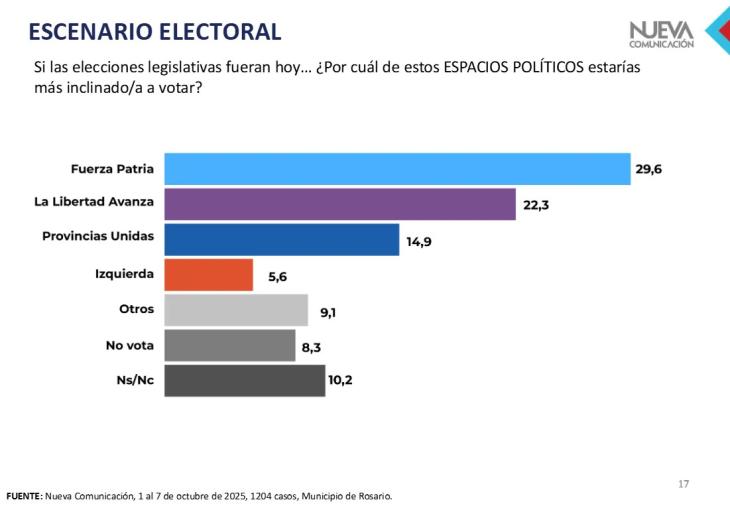 Cuando el análisis se realiza por espacio político, los números varían levemente: Fuerza Patria baja a 29,6%, La Libertad Avanza sube a 22,3% y Provincias Unidas se mantiene en 14,9%. El estudio, con 1.204 casos y un margen de error de ±3,5 puntos, combinó encuestas presenciales y online.
