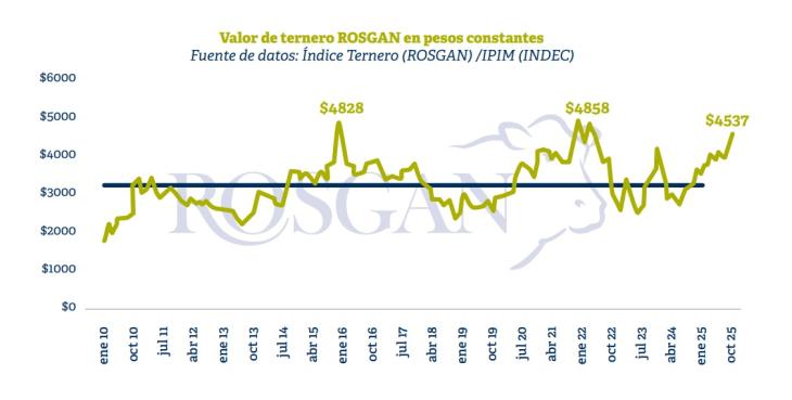 Según ROSGAN, al medir la serie desde enero de 2010 en pesos constantes ajustados por inflación (IPIM), el valor actual del ternero se ubica un 40% por encima del promedio de los últimos quince años. “Es el tercer valor más alto, solo por detrás de los máximos registrados en diciembre de 2015 y diciembre de 2021”, señaló el reporte.