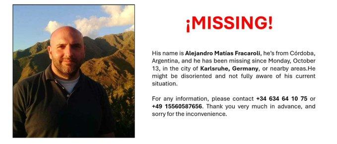 La comunidad científica argentina y alemana permanece en vilo por la desaparición del investigador cordobés Alejandro Fracaroli, de 44 años, quien se encuentra sin contacto desde el pasado lunes en la ciudad de Karlsruhe, al suroeste de Alemania.