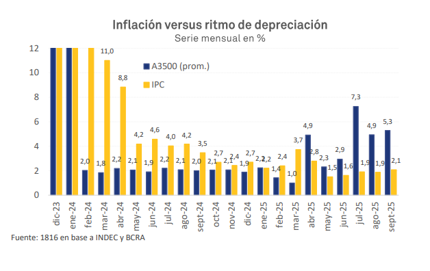 El otro aspecto a destacar es el bajo pase a precios de la devaluación. Mientras el dólar aumentó 5,3% en promedio en septiembre, los precios subieron 2,1%.