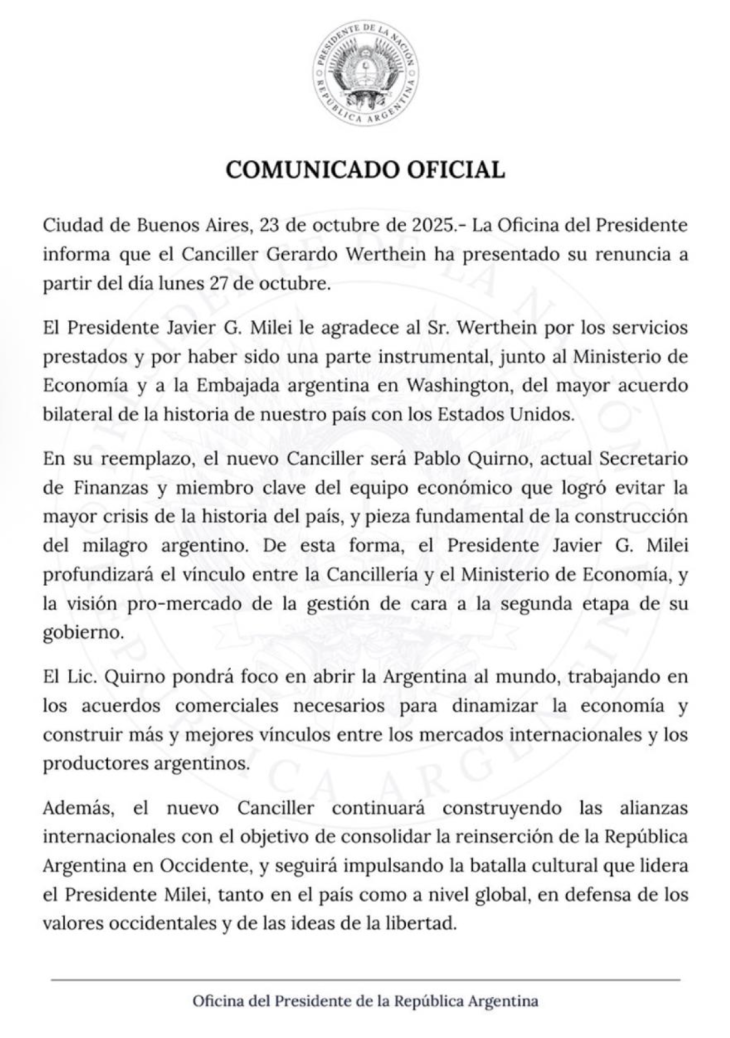 Quirno asume en un momento explosivo: su predecesor se fue después de firmar 44 designaciones, 29 traslados y nombramientos de secretarios y cónsules que parecían regalos de despedida. En la Casa Rosada, aseguran que Werthein “filtró su renuncia” a días de las elecciones para generar un sacudón en el gabinete. Y mientras tanto, embajadores amigos, viajes de lujo y una Cancillería que funcionaba más como club de privilegio que como oficina del Estado, siguen siendo los fantasmas que Quirno debe exorcizar.