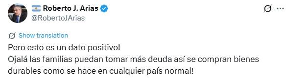 “¡Pero esto es un dato positivo! ¡Ojalá las familias puedan tomar más deuda así se compran bienes durables como se hace en cualquier país normal!”, destacó Arias.
