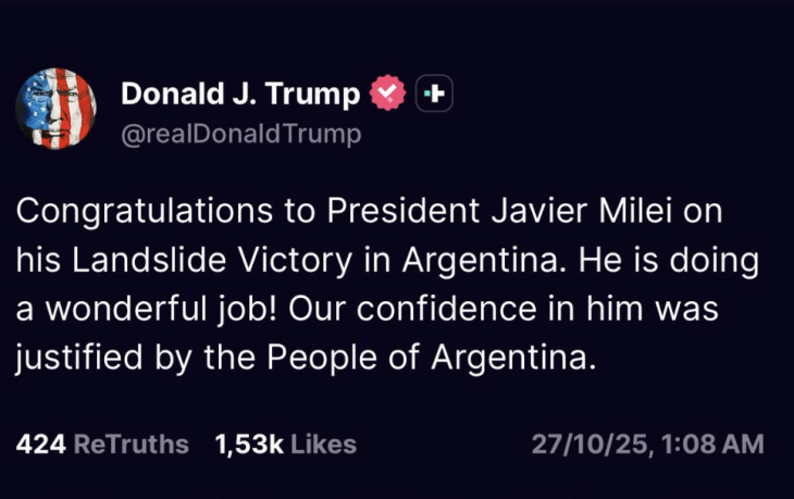 El presidente Donald Trump fue uno de los primeros en pronunciarse, felicitando a Milei por una “victoria aplastante” y asegurando que “el pueblo argentino justificó nuestra confianza en él”.