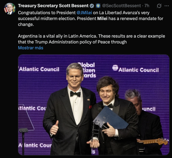 Desde el entorno del gobierno argentino se interpretó este apoyo como una validación de su línea económica. Tras meses de ajustes fiscales y reformas estructurales, la victoria legislativa refuerza la idea de que el país transita un camino de recuperación. Funcionarios de la Casa Blanca y del Departamento del Tesoro también felicitaron al mandatario, destacando la importancia de Argentina como “aliado vital en América Latina”. Según el secretario del Tesoro, Scott Bessent, el triunfo de Milei representa un “mandato renovado para el cambio”.