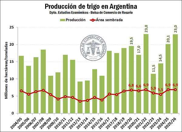 De acuerdo a la primera estimación de la Bolsa de Comercio de Rosario (BCR), la producción nacional del trigo 2025/26 llegaría a 23 millones de toneladas. De cumplirse esta proyección, representaría un incremento interanual de 14% y empataría el récord productivo del ciclo 2021/22.