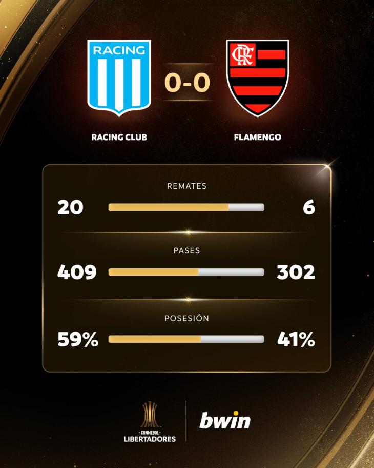 A esas alturas, Racing ya había revertido las estadísticas: tras un primer tiempo parejo (5-6 en remates), terminó el partido con 20 tiros contra apenas 6 del rival. Flamengo no generó ninguna chance clara en el complemento.
