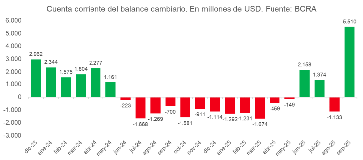 La cuenta corriente del balance cambiario rompió récord en septiembre: fue positiva por USD 5.510 millones.