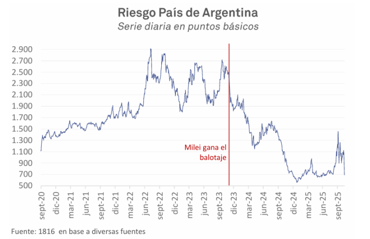 Para eso, el riesgo país debería seguir bajando y romper el piso de 570 pbs, alcanzado en enero de 2025.